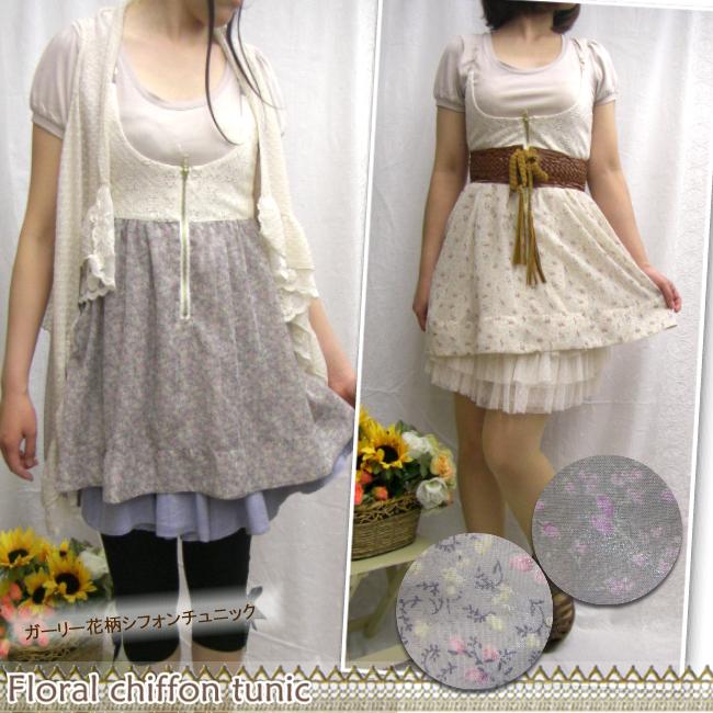 ロマンティックに浸る最高ガーリー素材使用★小花柄シフォン×チュールレースのアンサンブル風チュニック